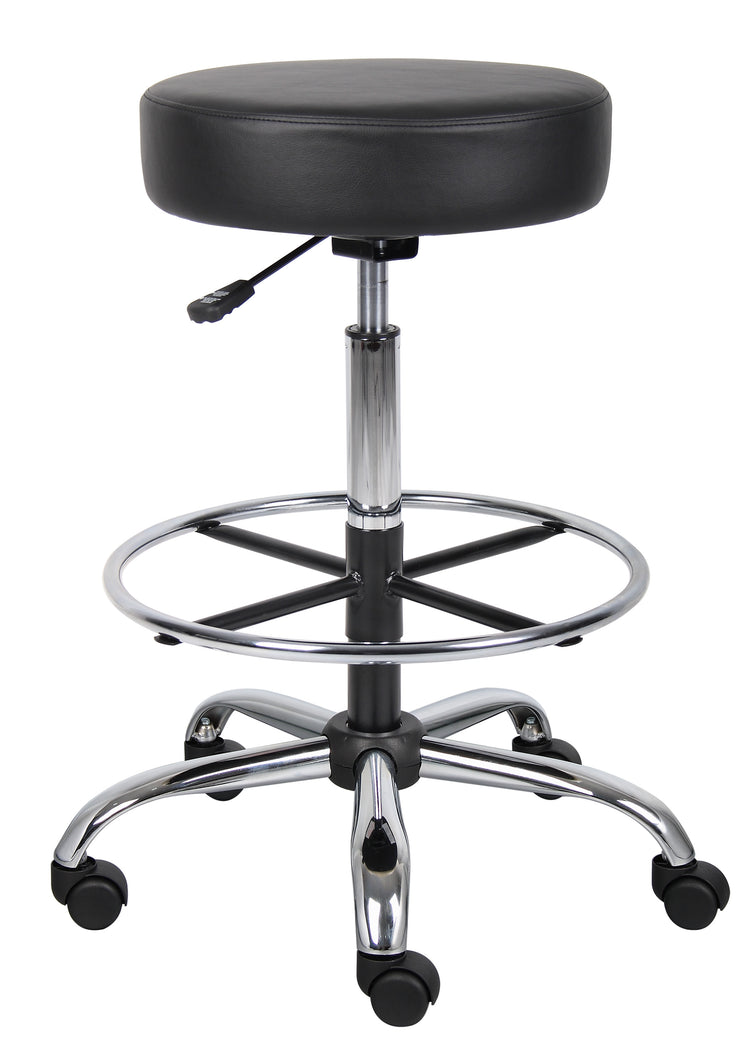 Boss Antimicrobial Vinyl Medical/Drafting Stool MODEL # B16240-BK / This medical stool is upholstered in durable Black, antimicrobial vinyl, and equipped with a 4” thick molded foam seat cushion that provides improved durability. It is attached with an easy to reach gas lift seat height adjustment lever, providing a vertical range of 6” to suit your personal comfort and work environment. The stool’s 20” chrome footring provides added foot and leg support. The hooded double wheel casters make it easy to move and shift directions. / 751118240917