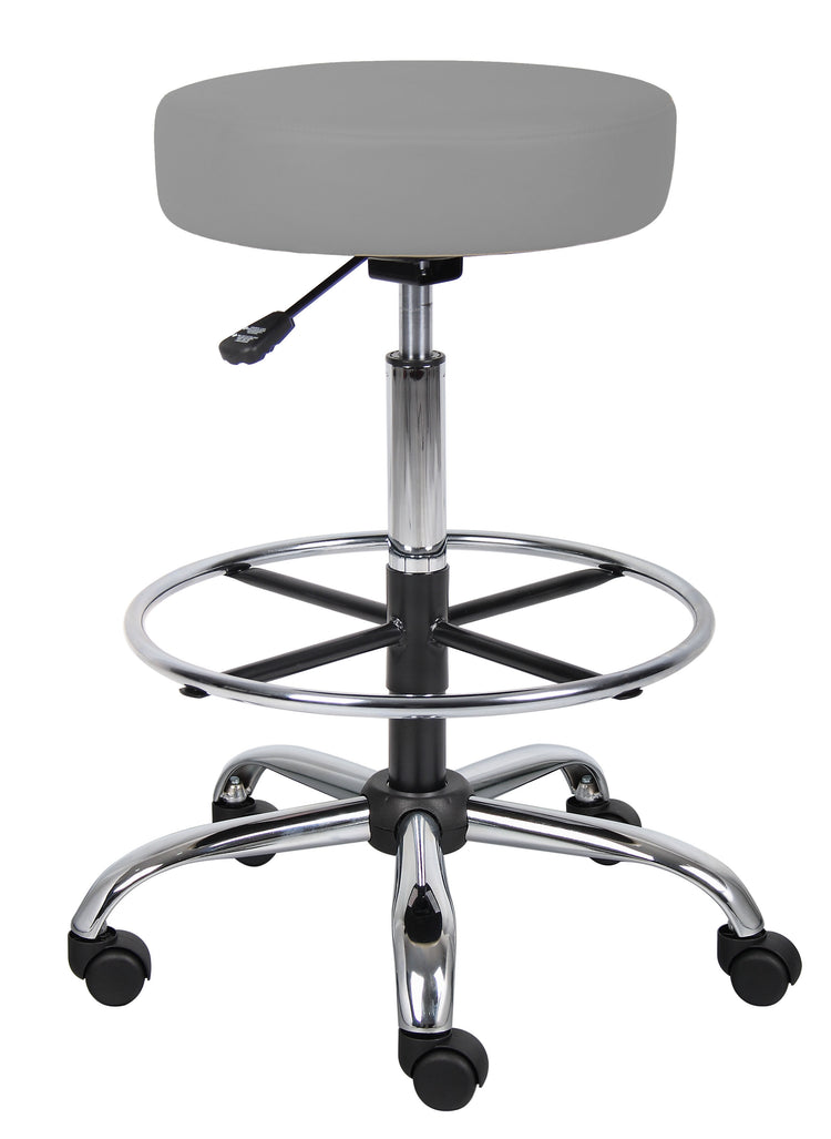 Boss Antimicrobial Vinyl Medical/Drafting Stool MODEL # B16240-GY / This medical stool is upholstered in durable Grey, easy to clean antimicobial vinyl, and equipped with a 4” thick molded foam seat that provides improved durability. It is attached with an easy to reach gas lift seat height adjustment lever, providing a vertical range of 6” to suit your comfort and work environment. The stool’s 20” chrome footring provides added foot and leg support. The hooded double wheel casters make it easy to move and shift directions. / 751118240931