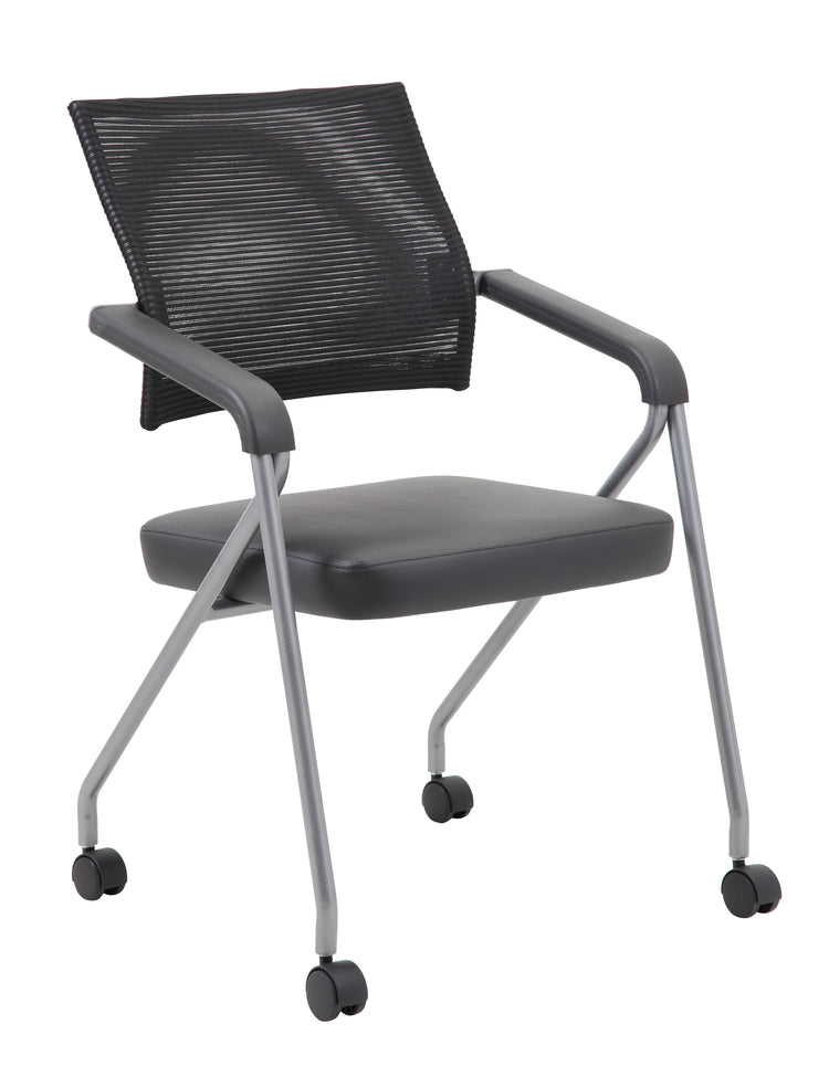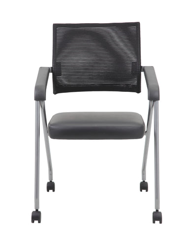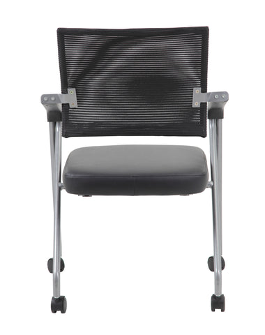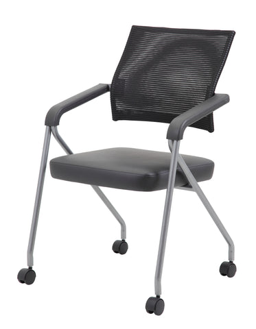 Boss Black Mesh Training Chair With Pewter Frame,2 In A Box MODEL # B1806P-BK-2 / This training chair is made with a nice mesh back and a Caressoft Plus seat. Caressoft Plus is a trademarked vinyl that is an ultra-soft upholstery that looks & feels like leather but more durable & easy to clean. The chair has a lustrous pewter frame with a 275 lbs. weight capacity and is sold as a set of two in a box. The chair base is a four leg tubular design with 2 inch nylon dual wheel castors for a smooth roll. / 751118180695