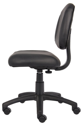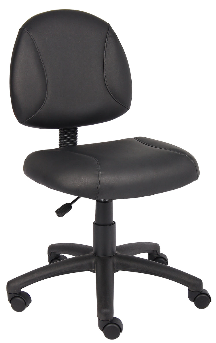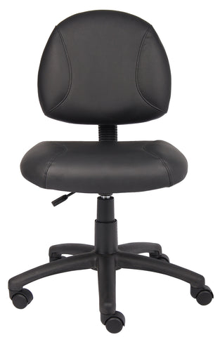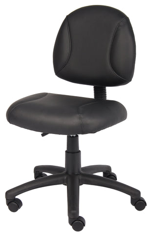 Boss Black Posture Chair MODEL # B305 / The Deluxe Posture Chair is upholstered in Black LeatherPlus (leather and polyurethane), for added softness and durability. In addition, it has thick padded seat and back with built in lumbar support for extra comfort. It has an adjustable back depth that can be easily customized for your personal needs. The pneumatic adjustable gas lift allows for easy seat height adjustment, to help you find the personalized sitting style that suits you and your work environment. The five star nylon base allows for smooth movement and stability. The hooded double wheel casters make it easy to move and shift directions. / 751118030518