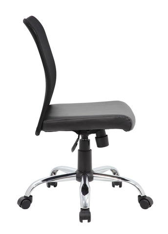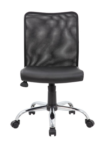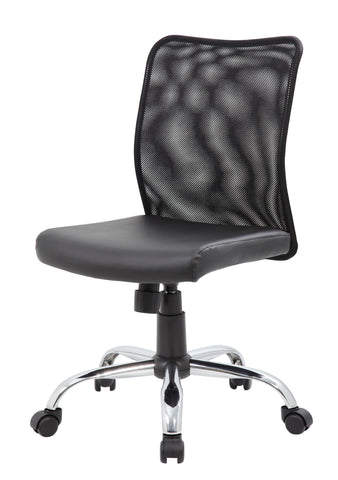 Boss Budget Mesh Task Chair MODEL # B6115C-CS / The budget mesh task chair is the perfect blend of a comfortable and professional design. The chair itself is created with a mesh backing for ultra-breathability, while the seat is designed with a solid, classy black vinyl. It also features a 25 inch chrome base with 2 inch nylon dual wheel castors for a smooth roll. The chair offers fantastic features such as a pneumatic gas lift that allows for easy adjustable height, as well offering a spring tilt mechanism, tilt tension and an upright lock. / 751118611588