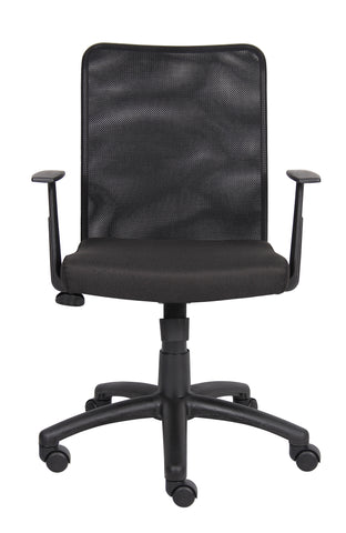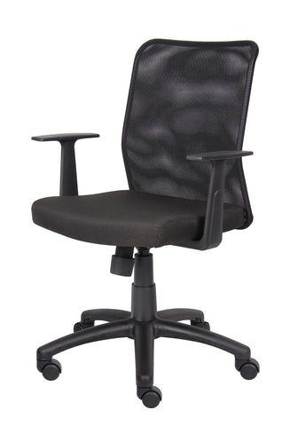 Boss Budget Mesh Task Chair W/ T-Arms MODEL # B6106 / This Budget Mesh Task Chair comes with an open breathable mesh back designed to prevent body heat and moisture build-up. The breathable fabric seat with padding will keep you cool and comfortable during extended periods of work. The adjustable tilt tension control knob, which is located under the seat, allows you to customize the tension of the tilt. It has an upright locking position feature, providing comfortable back support. The pneumatic adjustable gas lift allows for easy seat height adjustment, to help you find the personalized sitting style that suits you and your work environment. The large 27’’ black nylon base provides added stability to the chair. The hooded double wheel casters make it easy to move and shift directions. The arms provide comfortable and natural arm rests. / 751118610611