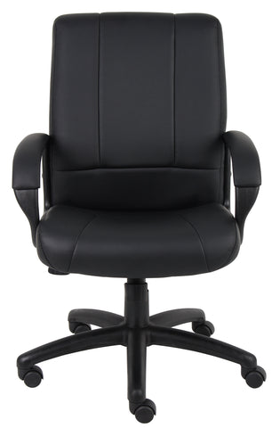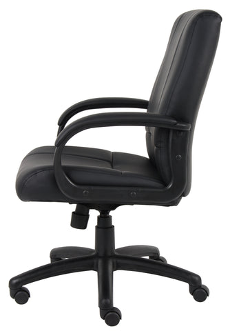 Boss CaressoftPlus Executive Mid Back Chair MODEL # B7906 / This executive mid back chair is elegantly upholstered with extremely soft and durable CaressoftPlus leather. It features integrated lumbar support and padded armrests decorated in comfortable CaressoftPlus upholstery. Additional features include an upright locking position, adjustable tilt tension control, and pneumatic gas lift seat height adjustment for a seat height that extends from 20” to 23.5”. All of this sits atop a sturdy 27” nylon base with five hooded double wheel casters for exemplary stability and maximum mobility. / 751118790610