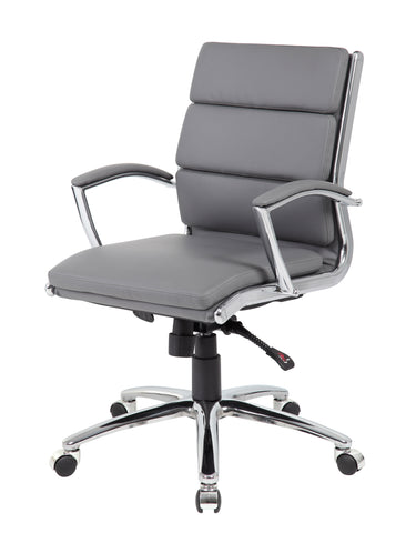 Boss Executive CaressoftPlus Chair with Metal Chrome Finish - Mid Back MODEL # B9476-GY / The mid-back executive CaressoftPlus chair in grey with the metal chrome finish is as comfortable as it is handsome. The chair utilizes a two paddle mechanism which designates one paddle for lift and one paddle to release spring tilt or lock; it is very heavy duty. The chair is made with a material called CaressoftPlus which is a trademarked vinyl that is an ultra-soft upholstery that looks & feels like leather, but more durable & easy to clean. The chair also offers tilt tension, a pneumatic gas lift and an upright lock. It has been designed with a sturdy 27 inch chrome base with 2 inch nylon dual castor wheels and has a weight capacity of 275 lbs. / 751118947625