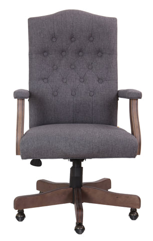 BOSS Executive Slate Grey Commercial Grade Linen Chair With Driftwood Finish Frame MODEL # B905DW-SG / When it comes to class and style the executive commercial grade linen chair in slate grey with driftwood finish frame is top of the line. The chair boasts a sturdy 27 inch traditional driftwood base with hooded brass castors for an elegant look, with a smooth roll. The padded arms are set at a fixed height and the chair utilizes a spring tilt mechanism. In addition to this, the chair also offers tilt tension, a pneumatic gas lift for easy height adjustability and an upright lock. / 751118090529
