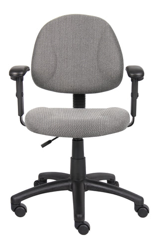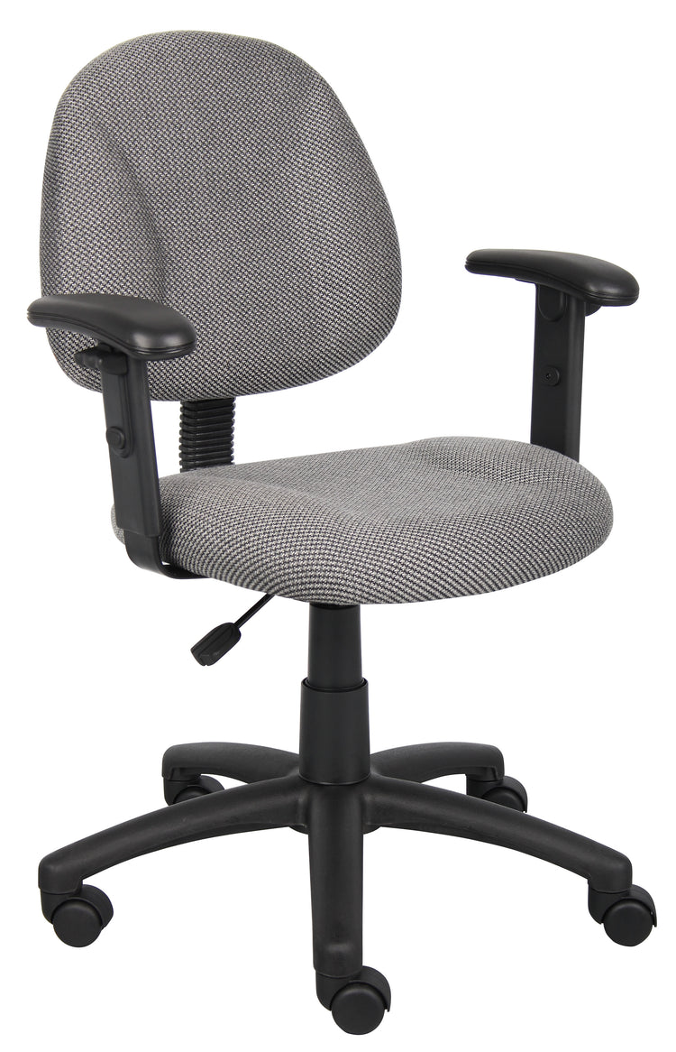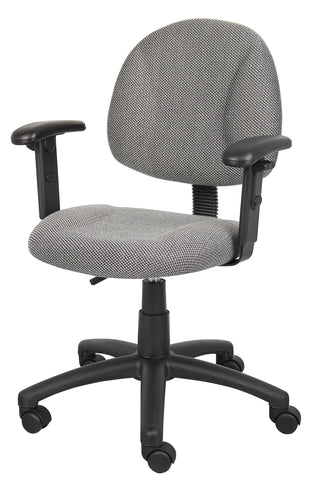 Boss Grey Deluxe Posture Chair W/ Adjustable Arms MODEL # B316-GY / This Grey Fabric Deluxe Posture Chair comes with a thick padded seat and back with built in lumbar support. It has an adjustable back depth that can be easily customized for your personal needs. The pneumatic adjustable gas lift allows for easy seat height adjustment, to help you find the personalized sitting style that suits you and your work environment. The five star nylon base allows for smooth movement and stability. The hooded double wheel casters make it easy to move and shift directions. The height adjustable arms provide comfortable and versatile arm rests that can suit your personal preferences. / 751118031621