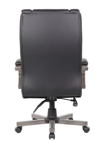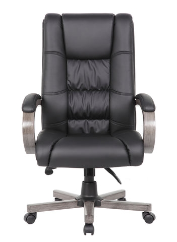 Boss High Back Executive Wood Finished Chair, Grey MODEL # B8991-GY / Our high back executive chair features a beautiful classic wood design and is elegantly upholstered in breathable Caressoftplus Vinyl. It features plush Dacron-filled top cushions with perforated centers, grey finished wood, and a heavy-duty dual paddle spring tilt mechanism with infinite lock. There’s also an adjustable tilt tension control and pneumatic gas lift seat height adjustment. All of this rests atop a sturdy 27-inch nylon base with five hooded double wheel casters for optimal mobility. / 751118500110