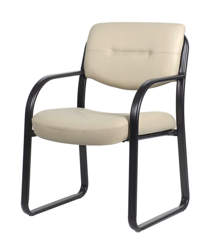 Boss Leather Sled Base Side Chair, Beige MODEL # B9529-BG / Discover the perfect blend of elegance and comfort with our LeatherPlus guest chair, upholstered in timeless beige. Upholstered with a luxurious mix of leather and polyurethane, this chair promises both durability and indulgent comfort. Its sleek, polished tubular steel frame with a black powder-coated finish adds a modern touch, while the contoured seat offers exceptional lumbar support. The gracefully curved arms are designed to effortlessly slide past the front edges when the chair is pulled up to the table, and the thick, contoured cushions provide extra comfort and support. Ideal for enhancing any room, this chair combines style and functionality with ease. / 751118952926