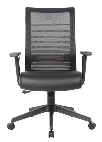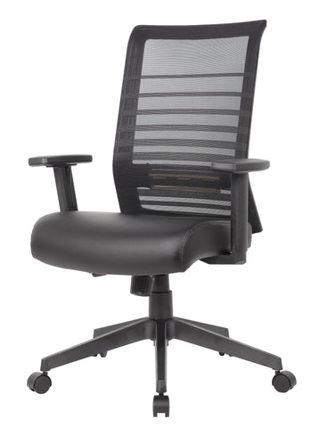 Boss Mesh and Antimicrobial Task Chair MODEL # B6566AM-BK / The horizontal mesh back task chair with antimicrobial seat, is designed with comfort and ease in mind. The chair features a technology called a Synchro-Tilt Mechanism. This allows the backrest and seat to tilt in unison. The back tilts more than the seat and is also tension adjustable. The chair also features adjustable arms, a pneumatic gas lift that allows for easy adjustable height and a weight limit of 275 lbs. making sure it is the perfect chair for most everybody. / 751118065664