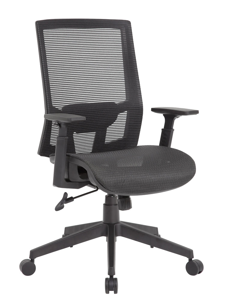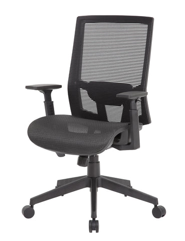Boss Mesh Back MODEL # B6044 / The breathable mesh back and seat task chair is designed with comfort and ease in mind. The chair features a technology called a Synchro-Tilt Mechanism. This allows the backrest and seat to tilt in unison. The back tilts more than the seat with a 2:1 ratio and it also includes a tilt tension knob which allows you to adjust the tilt tension for optimal support. The chair also features height adjustable arms, a pneumatic gas lift that allows for easily adjustable height and it has a maximum weight capacity of 275 lbs. The chair has a 27" nylon base and 2 -inch hooded, double wheel, casters. / 751118604412