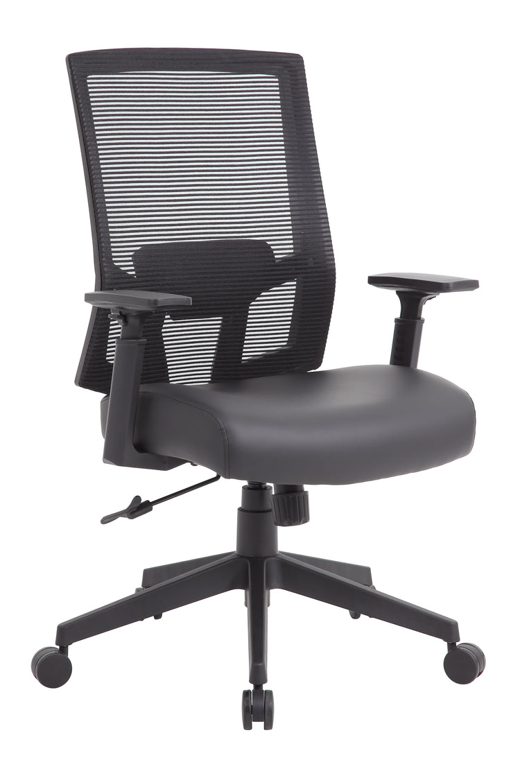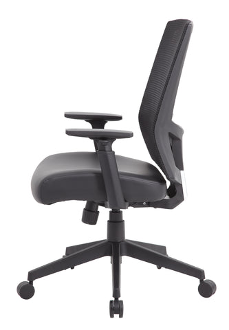 Boss Mesh Back Task Chair MODEL # B6044AM-BK / The breathable mesh back task chair is designed with comfort and ease in mind. It's seat cushion is upholstered in a durable and cleanable antimicrobial vinyl. The chair features a 2:1 synchro-tilt mechanism for added comfort. This allows the backrest and seat to tilt in unison.and it also includes a tilt tension knob which allows you to adjust the tilt tension for optimal support. The chair also features height adjustable arms, a pneumatic gas lift that allows for easily adjustable height and it has a maximum weight capacity of 275 lbs. The chair has a 27? nylon base and 2 -inch hooded, double wheel, casters. / 751118604429