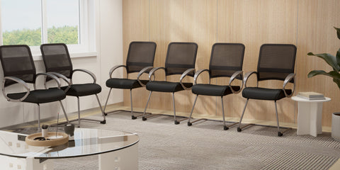 * Beautifully upholstered in Black LeatherPlus (seat) and breathable mesh (back)* Pewter finished loop arms* Metal Pewter finished cantilever sled base*