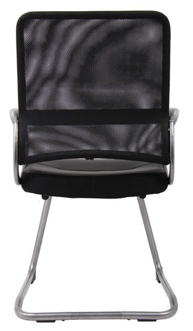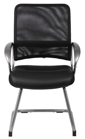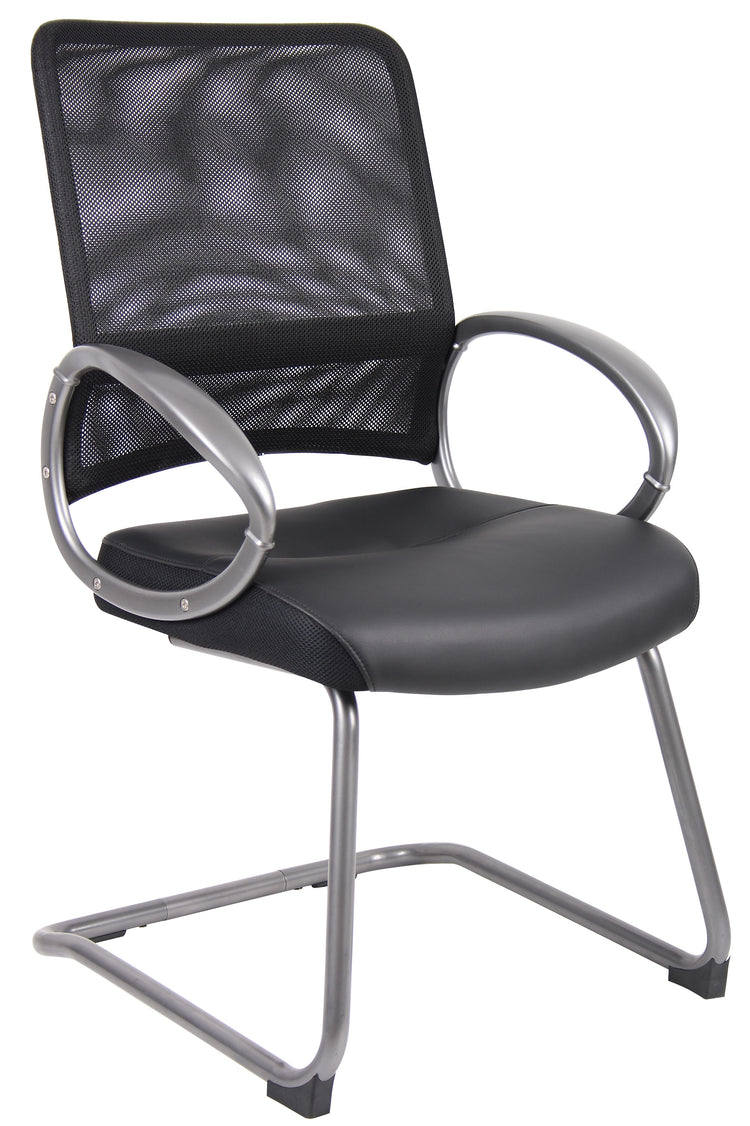Boss Mesh Back W/ Pewter Finish Guest Chair MODEL # B6409 / This Mesh back task chair is a matching guest chair for the Manegers Mesh Chair. It features a breathable mesh back designed to prevent heat and moisture build-up, so you can remain cool and comfortable through extended periods of work. The seat is beautifully upholstered in Black LeatherPlus, for added softness and durability. Its Pewter finish loop arms are stylish and provide comfortable, natural arm rests. The chair sits on a stable and sleek cantilever base. / 751118640915