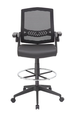 Boss Mesh Drafting Stool w/ Flip Arms MODEL # B16223-BK / The flip arm drafting stool comes in sleek black and features a luxurious seat and breathable mesh back that helps to distribute weight evenly, and provide back support by conforming to each individual’s back shape. With a weight limit of 275 lbs. the stool is a very versatile, comfortable seating option for most any office or studio and provides a pneumatic gas lift mechanism for adjustable height options. The stool also features adjustable, flip arms for maximum comfort and a sturdy 25 inch nylon base with 2 inch nylon dual wheel castors for a smooth roll. / 751118622379