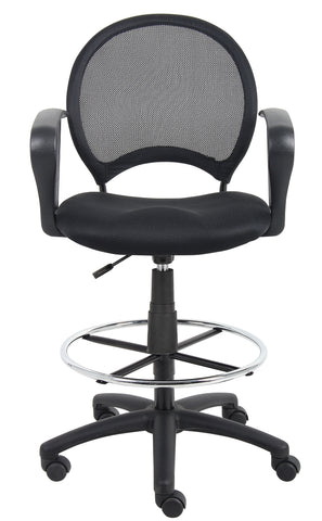 Boss Mesh Drafting Stool W/ Loop Arms MODEL # B16217 / This mesh drafting stool comes with an open breathable mesh fabric that will keep you cool and comfortable during extended periods of work. The seat is supported with a solid metal back frame with ballistic nylon wrap, providing a stable and comfortable back rest. The pneumatic adjustable gas lift allows for easy seat height adjustment, to help you find the personalized sitting style that suits you and your work environment. The 20” chrome footring provides added foot and leg support. The 25” nylon base provides added stability to the chair by spreading the load over a larger surface area. The hooded double wheel casters make it easy to move and shift directions. The Loop Arms make for comfortable and natural arm rests. / 751118162172