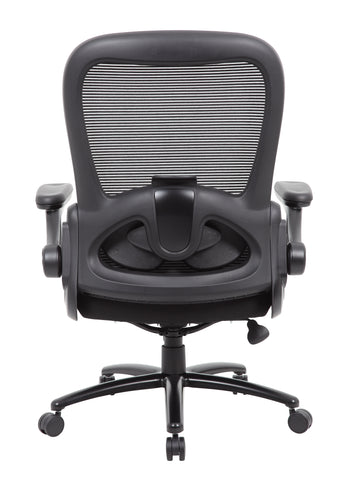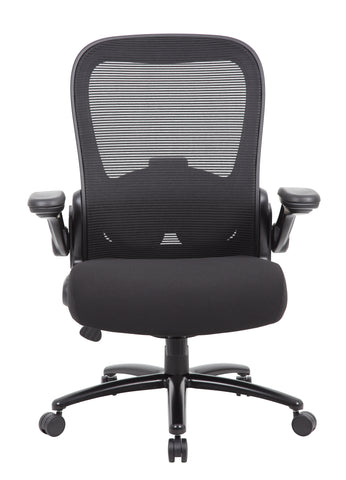 Boss Mesh Heavy Duty Chair, 400 lb weight capacity MODEL # B601-BK / Our heavy duty flip arm mesh chair makes the perfect companion to any office, board room, or study. Its 400 pound weight capacity ensures a comfortable sitting experience with a broad range of body types. It’s seat is elegantly upholstered in black fabric and features high density foam and springpack construction for added comfort. The mesh back features adjustable lumbar and allows the cushion to breath with no moisture build up. It has height adjustable flip up arms. The chair features a pneumatic gas lift seat height adjustment, a heavy duty spring tilt mechanism, and tilt tension control. All of this sits atop a large 27” steel base with five large heavy duty casters. / 751118601831