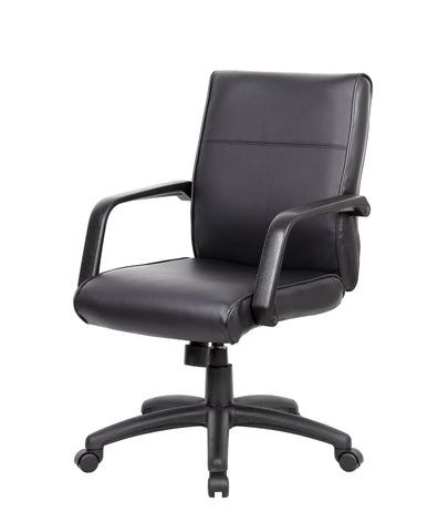 Boss Mid Back Executive Chair In LeatherPlus MODEL # B686 / Our Executive LeatherPlus chair takes comfort and style to a whole new level. Its Black LeatherPlus upholstery ensures maximum comfort with its softness and durability. Additional features include passive ergonomic seating with integrated lumbar support, pneumatic gas lift seat height adjustment, and spring tilt mechanism. There’s also an adjustable tilt tension control that allows for adjustments based on weight. Finally, the chair sports five hooded double wheel casters and a 27” nylon base that provides ample stability. / 751118068603