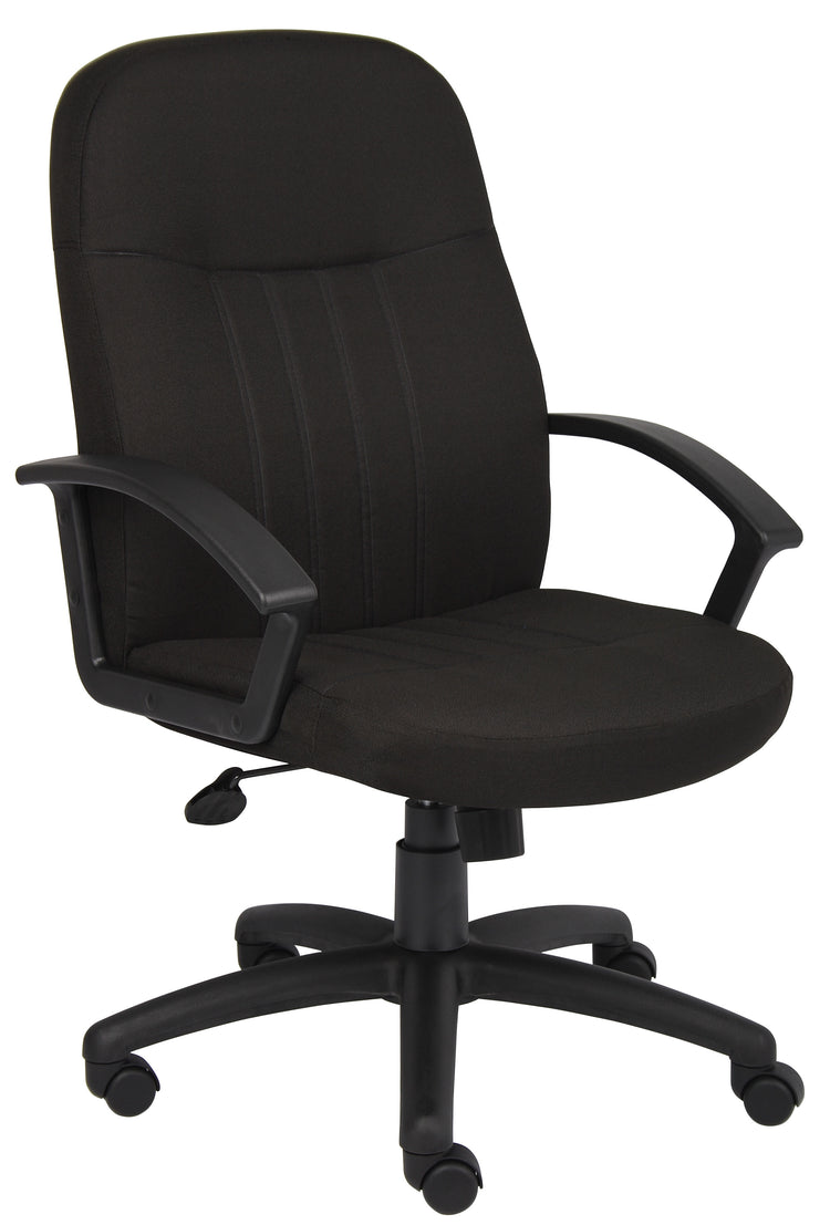 Boss Mid Back Fabric Managers Chair In Black MODEL # B8306-BK / Our deluxe posture chair is perfect for anyone who requires an ergonomic design coupled with integrated lumbar support. It features a distinctly classic appearance and can be personalized to the user’s taste thanks to its adjustable height arms, pneumatic gas lift seat height adjustment, and adjustable back depth. There’s also a built-in tilt tension that provides precise control over weight distribution, as well as an upright locking position. It pairs perfectly with our mid-back fabric guest chair (B8309-BK). / 751118830613