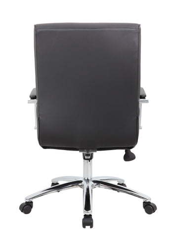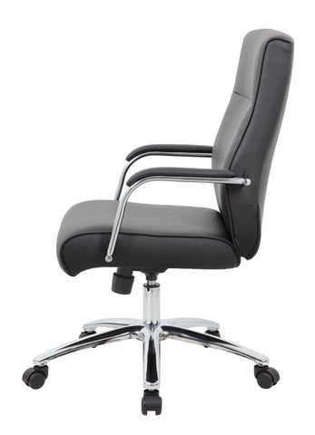 Boss Modern Executive Conference Chair - Black MODEL # B696C-BK / The Modern Executive Conference Chair in black is a fine looking chair made with high quality CaressoftPlus vinyl. CaressoftPlus is a trademarked, ultra-soft upholstery that looks & feels like leather, but more durable & easy to clean. The chair also features a spring tilt mechanism that allows one to change the angle of the entire seat relative to the floor and allows one to transfer some of the upper body weight to the backrest of the chair. In addition to this the chair also boasts a sturdy 27 inch chrome base with 2 inch nylon dual wheel castors and a 275 lbs. weight capacity. / 751118069693