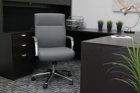 Boss Modern Executive Conference Chair - Grey MODEL # B696C-GY / Our executive Caressoft chair is beautifully upholstered with comfortable and durable Caressoft covering. It features an adjustable tilt tension control, pneumatic gas lift seat height adjustment, and sleek grey Caressoft upholstery. Its integrated lumbar support and padded armrests ensure optimal comfort and efficiency, while its large 27” base provides greater stability. The base itself rests atop five hooded double wheel casters for optimal mobility. Those looking for a practical, ergonomic seating solution need look no further. / 751118069679
