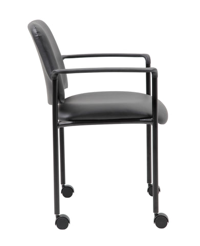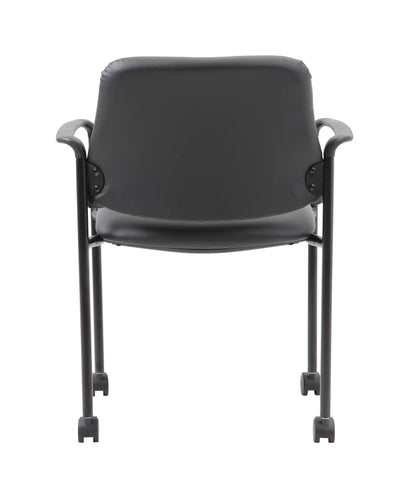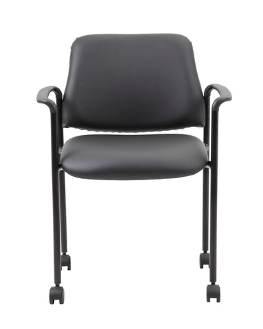 Boss Square Back Diamond Stacking Chair W/Arm In Black Caressoft MODEL # B9503R-CS / The square back Diamond stacking chair in black vinyl offers the perfect seating solution for any space. The chair is made with a gorgeous antimicrobial vinyl upholstery that looks & feels like leather, but is more durable and can be cleaned with a damp cloth. The chairs can be stacked 4 high for ultimate storage capacity. It is designed with black fixed arms for extra comfort and adds a pop of class to any room or office. The chair has a sturdy four leg tubular base in black steel with 4 hooded dual wheel casters and offers a weight capacity of 275 lbs. / 751118950366