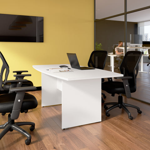 The underside of the boardroom table is also finished to prevent snagged clothing and chipping over time. The long office table's sturdy wooden base includes adjustable levelers for maximum stability on any surface. Choose from a variety of finish options to complement any modern or traditional workspace.