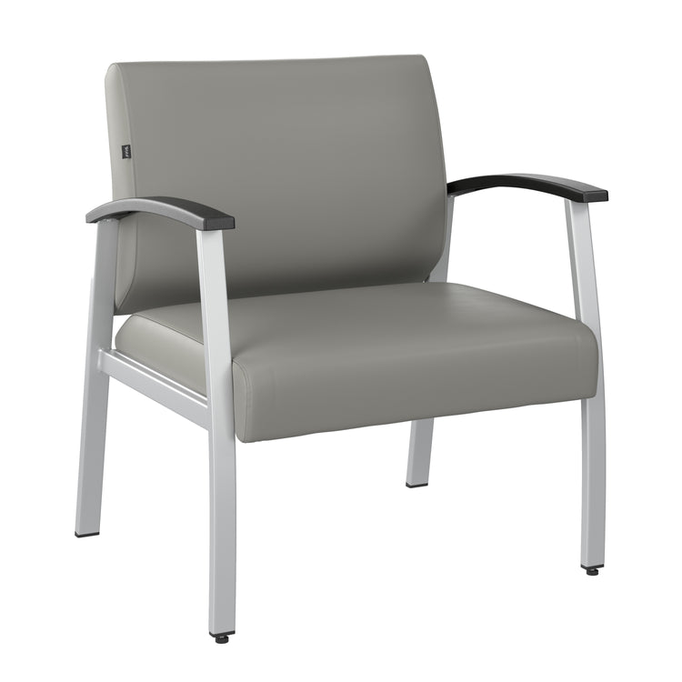 The Bush Business Furniture Arrive Bariatric Guest Chair with Arms is perfect for treating your visitors to a reception area that's stylish, practical, and comfortable. Highlighted by its commercial quality build and thick cushioned upholstery, this durable waiting room chair is right at home in a commercial workplace, doctor's office, hospital, school, salon, or any other high-use common area. An ergonomically contoured backrest and rounded arms are designed to reduce stress and discomfort by promoting good posture. Sturdy metal legs and framework allow the big and tall guest chair to support up to 450 pounds, and levelers are included to compensate for uneven flooring. The padded seat features antimicrobial vinyl upholstery that inhibits the spread of bacteria, is quick and easy to clean, and resists cuts and tears while conveying a modern professional appearance. This extra large office reception chair has been meticulously tested to meet or exceed ANSI/BIFMA quality standards for safety, durability, and performance and is backed by the Bush Business Furniture 5 Year Manufacturer's Warranty. Complete your organization's waiting room furniture set with the Arrive Guest Chair, Loveseat, Reception Desk and more (coordinating items sold separately).