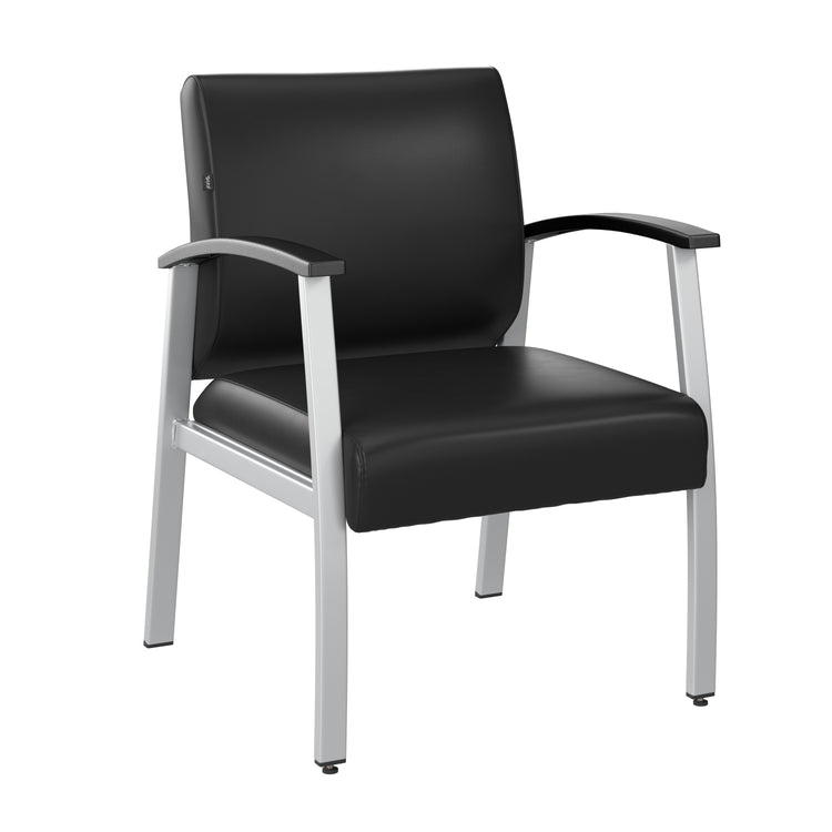 The Bush Business Furniture Arrive Guest Chair with Arms is perfect for treating your visitors to a reception area that's stylish, practical, and comfortable. Highlighted by its commercial quality build and thick cushioned upholstery, this durable waiting room chair is right at home in a commercial workplace, doctor's office, hospital, school, salon, or any other high-use common area. An ergonomically contoured backrest and rounded arms are designed to reduce stress and discomfort by promoting good posture. Sturdy metal legs and framework allow the reception chair to support up to 275 pounds, and levelers are included to compensate for uneven flooring. The padded seat features antimicrobial vinyl upholstery that inhibits the spread of bacteria, is quick and easy to clean, and resists cuts and tears while conveying a modern professional appearance. This office guest chair has been meticulously tested to meet or exceed ANSI/BIFMA quality standards for safety, durability, and performance and is backed by the Bush Business Furniture 5 Year Manufacturer's Warranty. Complete your organization's waiting room furniture set with the Arrive Bariatric Guest Chair, Loveseat, Reception Desk and more (coordinating items sold separately).