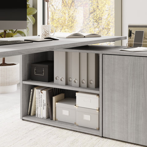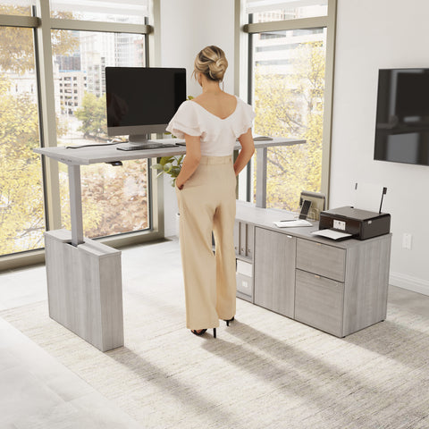 An intuitive control panel, programmable height presets, and a customizable sedentary alert help maintain healthy habits and boost productivity. A small bookcase wraps around either leg of the desk for convenient access to open storage, while a coordinating cabinet can be placed beside it to create an L-shaped workspace.
