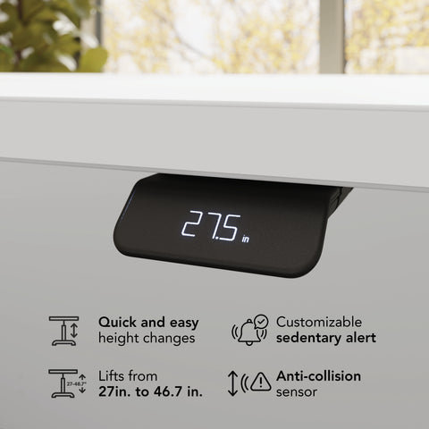 The L-shaped design provides a spacious surface ideal for multitasking. The desk adjusts quickly from 27 to 46.7 inches to encourage movement and sustained focus. An intuitive control panel, programmable height presets, and a customizable sedentary alert help maintain healthy habits and boost productivity. Durable surface resists scratches and stains, while a welded steel base provides reliable supportt for up to 200 pounds of equipment.