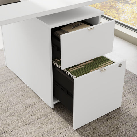 Two file cabinets conceal the desk legs and offer convenient storage with one small drawer and one file drawer each—perfect for keeping supplies and documents secure thanks to a single lock. Smooth ball-bearing slides ensure easy access, and tack glides help protect flooring. Modesty panels and built-in wire management maintain a professional office aesthetic.