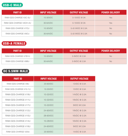 • Hardwire charger includes USB Type-C male connection with input of 10-30VDC and output of 5-12VDC