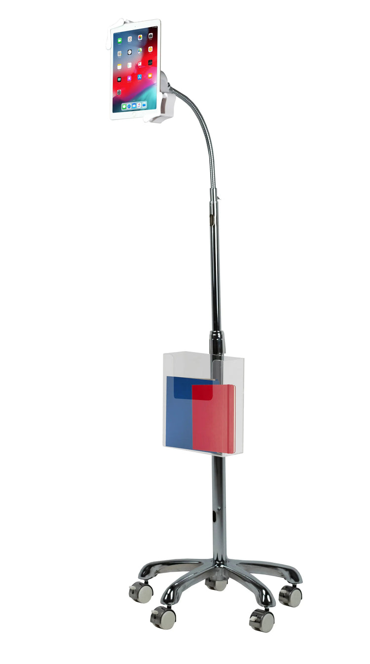 This attachable Brochure Holder Add-On is perfect for trade shows, sales meetings, medical offices, or any place you need a handy place to store and display important company or product information. It easily grips the central pole of your CTA Digital tablet floor stand, providing convenient display and storage for your brochures, paperwork, flyers, accessories, and more.