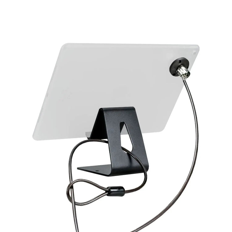 This portable tablet security kit gives you the theft-protection and display options of a bulkier kiosk while occupying only a fraction of the space. First, the compact metal plate sticks on to the back of your tablet with an industrial grade 3M adhesive strip, withstanding even forceful attempts at removal. Next, the steel security cable locks into the Kensington slot on the plate with an included key, anchoring your tablet to a table leg or other permanent fixture at the other end. The cable can also be looped to this kit’s metal stand base, which itself can mount to your desk, tabletop, or counter via holes at the base. This metal stand base supports your tablet in landscape or portrait orientations and is outfitted with a cutout to allow access to your device’s charge port. The stand also features no-slip, no-scratch padding within its lip and on its underside.
