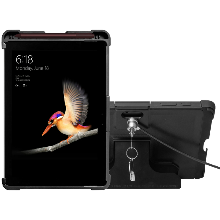 This sleek, portable Security Case offers exceptional functionality while protecting your Surface Go from theft, making it an invaluable accessory for conference rooms, classrooms, restaurants, and offices. The streamlined case features a built-in folding kickstand for easy tabletop setup, a convenient Surface Pen holder grip, and openings for all cameras, ports, and jacks. Your tablet stays protected with the galvanized steel anti-theft cable, which attaches easily to the K-slot at the back, locking your tablet in. The other end can be looped through any permanent fixture.