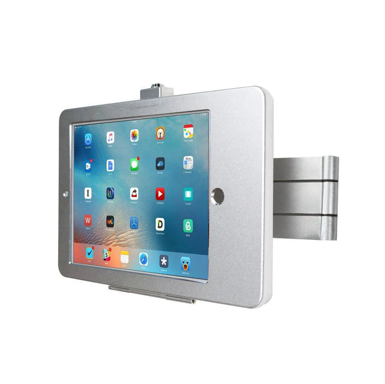 Security meets functionality with the Articulating Wall Mounting Security Enclosure that is Perfect for classrooms, conference rooms, or doctors’ offices, this powerful holder makes your iPad the protected centerpiece of your workspace. 4 flexible joints allow for vast positioning options, while a 360-degree rotating tablet enclosure enables quick shifts between portrait and landscape orientations. This arm mount combines its full range of maneuverability with ingenious space-saving design, folding from its maximum extension of 16.5 inches to nearly flush against the wall. A top-notch lock and key security system keeps your device protected against theft. The arm mounts easily to any wall with a set of included hardware, and the secure case enclosure allows access to all ports, buttons, and cameras. This case can be outfitted with an included metal Home button cover to prevent unwanted menu access. This case also features a multi-faceted charge cable management system, employing slack-organizing space inside the case and a rubberized cutout at the rear.