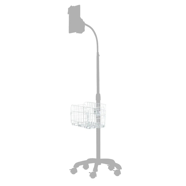 This attachable Metal Basket Add-On grips the central pole of CTA Digital tablet floor stands, providing a spacious storage area for your accessories, paperwork, cables, PPE, and more. The basket detaches and folds nearly flat for easy storage when not in use.