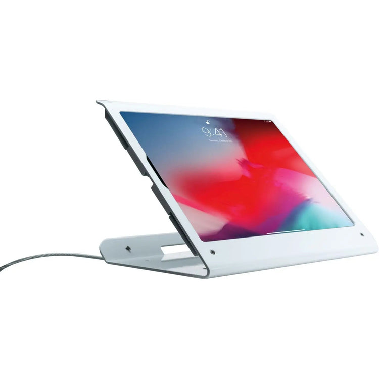 Show off your sleekly modern 3rd Generation iPad while keeping it safe and secure with the Rotating Theft-Deterrent Kiosk Stand, a comfortable addition to any point of sale, showroom, or classroom. The ultra-secure theft deterrent design means your iPad is secured to the case with four screws that can only be opened by a proprietary tool, making it impervious to lock-pickers or thieves carrying traditional tools. When it comes to mounting, this kiosk stand comes with two distinct options: First is the swivel stand, which allows the entire kiosk 360 degrees of rotation for smooth point-of-sale transactions. The second, more secure option involves using the included mounting hardware to affix the entire metal platform directly to a surface. The sleek metal design matches the aesthetics of the iPad 12.9 perfectly while simultaneously protecting the device from damage and allowing full access to the available ports and headphone jacks.