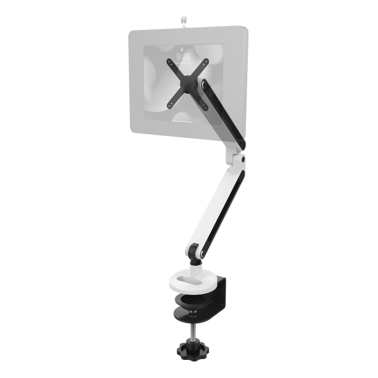 This sleek, articulating monitor arm creates a secure space saving solution on countertops, tables or desks. It’s an ideal solution for hotel lobbies, conference rooms, classrooms, waiting rooms, or any place that requires a screen with lots of angle adjustment. The padded base mounts to surfaces up to 2.36-inches thick via simple rotary C-clamp. When the mount is in place, use the provided security tool to lock the clamp. The VESA plate at the top of the mount attaches to    , and can be easily set up for either portrait or landscape orientation. The head rotates 360 degrees and tilts at 3 axes, allowing for virtually any screen placement. The center joint features a 19-inch vertical adjustment. It can be loosened, repositioned, and locked in place with an included Allen key. The base joint also allows full rotation, allowing convenient angle adjustments. Weight load capacity is 5 lbs.