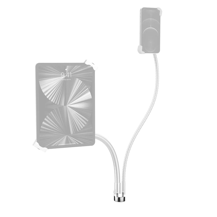 Double the device-holding capability of any of CTA Digital’s mobile floor stands with this handy Floor Stand Add-on for Dual Goosenecks. This small-but-mighty tool screws easily into the top pole, and allows users to add 2 flexible goosenecks with phone or tablet holders (sold separately). Imagine the hands-free capabilities of teleconference on a cell phone while looking up supporting data on a tablet, creating 2-camera setups for video capture or vlogging, or simply having a place to securely stow a phone while moving from place to place.