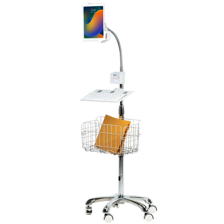 This ultra-durable, Heavy-Duty Gooseneck Floor Stand gives you access to your tablet at virtually any angle, with a telescoping, height-adjusting pole and flexible aluminum gooseneck. At the top of the gooseneck is a VESA plate, which can connect to VESA-ready tablet cases, or directly to the included tablet holder. The slide-open tablet holder tilts side to side and rotates 360 degrees, easily accommodating portrait or landscape orientations. Also included is an attachable multi-purpose storage cradle, perfect for an external battery pack or a stack of business cards, plus a larger storage basket and an angle-adjustable keyboard stand. Five locking wheels attach to the chrome-plated stand base, making moving this stand a breeze. Exceptional flexibility, adjustability, and mobility make this tablet stand a welcome addition to a living room, study, doctor’s office, classroom, or tradeshow. With its sturdy construction and easy maneuverability, the Heavy-Duty Gooseneck Floor Stand is the ideal solution for professional and personal spaces alike.