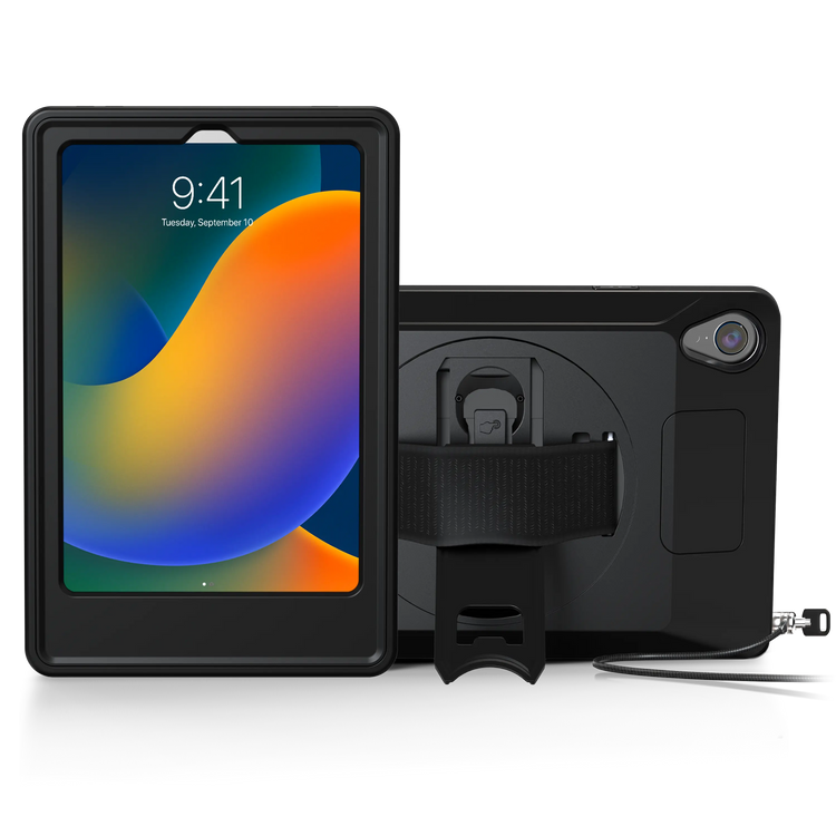 With the VersaGuard Protective Tablet Case, enjoy fast, effortless handheld-to-dock setups. This protective tablet case keeps your iPad Mini 6 & 7 shielded from collisions and falls. (Tablet not included) Its durable, rugged frame provides heavy-duty impact shielding without compromising usability. An outer silicone jacket offers further protection. The inner case has 4 security screws that tighten with the included anti-theft deterrent security key tool. There is also an internal built-in power cable that connects to your tablet and allows you to directly connect your power cord to the power port. This rugged tablet case employs powerful embedded magnets at its rear to enable instant mounting to metal surfaces. Your tablet will be easily accessible on the wall of any kitchen, garage, gym, or even on the front of your refrigerator. The case is designed to allow full access to the tablet’s ports, buttons, and two charging ports: and USB-C. There are built-in elastic hand straps on the back and there is a useful foldout kickstand for fast, easy tabletop display options. There are two anchor points on each short end of the case and a port cover for add-on attachments such as a card reader. And an additional two anchor points on the long side for a shoulder strap (not included) when you need to keep your hands free. Docking stations available (not included).