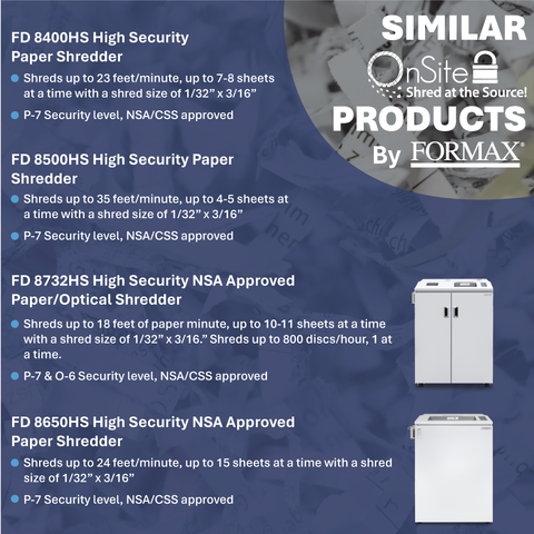 The Formax FD 8300HS High Security Deskside Shredder offers Level 6 Security in a compact, rugged design that fits right under a desk to shred “Top Secret” or classified documents.