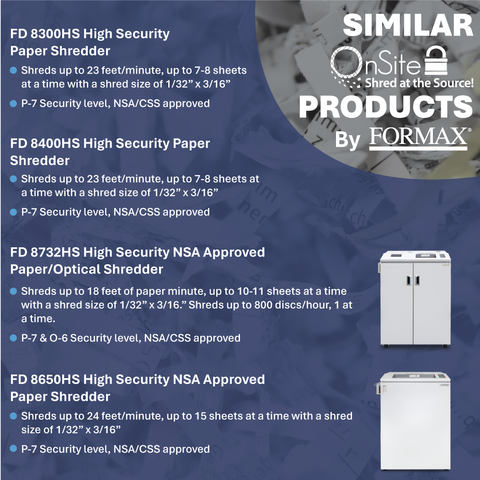 The FD 8500HS has been evaluated by the NSA and meets the requirements of NSA/CSS specification 02-01 for Level 6 high security cross cut shredders.
