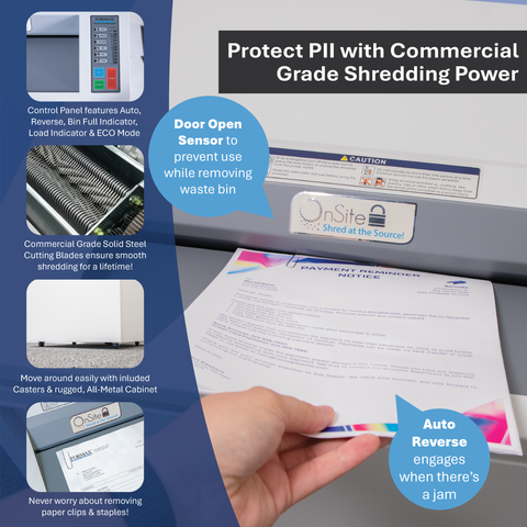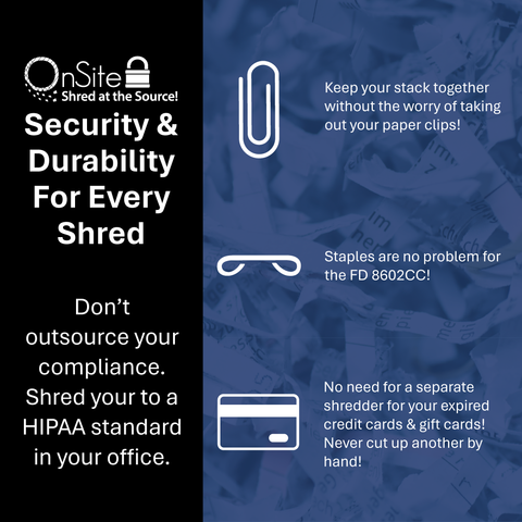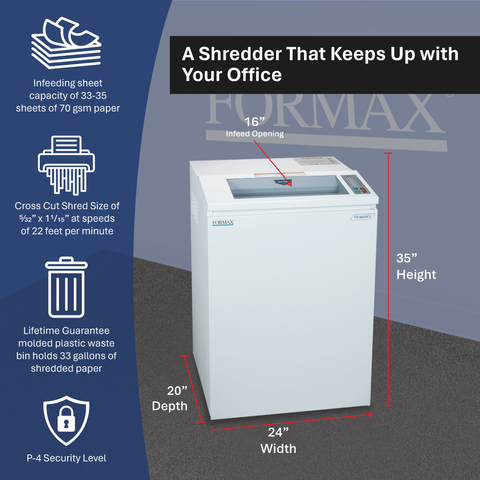 The Formax OnSite FD 8602CC Office Shredder features an extra wide 16" feed opening combined with commercial-grade components in a sleek, practical design.